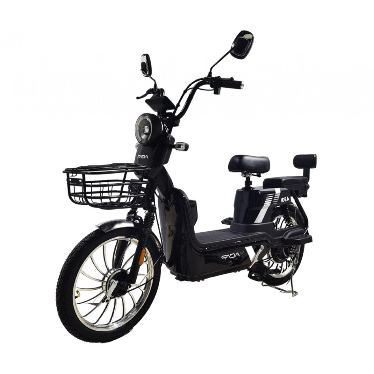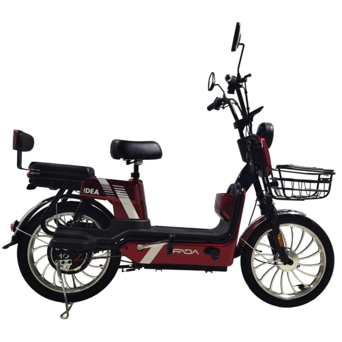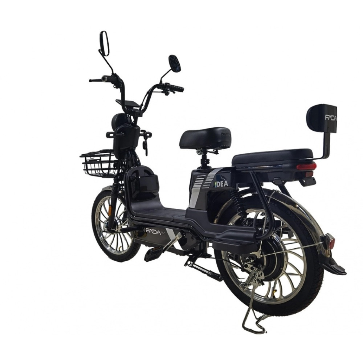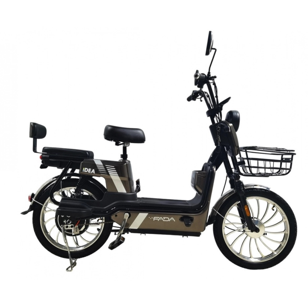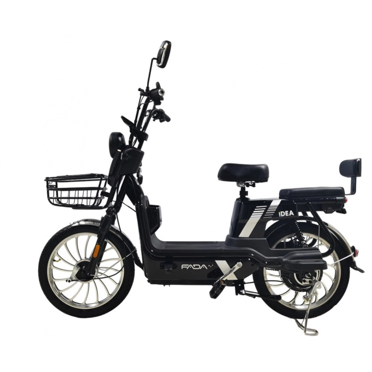 Нова модель електричного велосипеда FADA IDEA, 600W Сама ідея цієї моделі співзвучна з її безпосереднім назвою IDEA. Схожі моделі в модельному ряду FADA вже були і є, але дана модель набагато вигідніше відрізняється від своїх родичів, як за зовнішнім фактором, так і в технічному плані. Головна перевага такої моделі в її зручності використання, в простоті і надійності конструкції + функціональність (багажники або друге сідло для пасажира). Дуже зручна по посадці для практично будь-якого віку (висока посадка і можливість зміни висоти сидіння в межах від 90-98 см до поверхні дороги), відмінна прохідність, завдяки 20-ти дюймовим колесам на легкосплавних дисках і амортизації передньої вилки та задньої частини, яка додає комфорт в управлінні. Невелика вага електровелосипеда в парі з мотор-колесом, як основний привід, дозволяє пороїзджати пристойну відстань виключно на електротязі не використовуючи при цьому педалі, які, у свою чергу, більш ніж функціональні і їх використання навіть рекомендоване за бажанням, в будь-якому із режимів їзди. На пасажирському місці можуть розміщуватися не тільки маленькі діти, а діти доросліші - місця більше і ноги є куди подіти, так як і підніжки передбачені і відстані від подушки сидіння до них значно більше, ніж в інших моделях. Потужність двигуна 600 Watt у парі з аккамулятронною батареєю на 20 А/год дозволить переміщатися навіть у місцевостях з великими ухилами дорожнього полотна, але при цьому запас батарей збережеться для подолання більшої відстані. Варіант мотора для IDEA можна було б використовувати ще потужніший, проте це не так додало б у швидкості, скільки активніше стало б “з“їдати“ заряд батарї, тому така комплектація – це принцип розумного застосування. Передбачені повноцінні педалі та реалізація функції активації електродвигуна при початковому обертанні педалей. Тобто педальний вузол повнофункціональний і його можна використовувати в будь-якому режимі їзди, навіть без електромотора (якщо батареї сіли) Максимальна швидкість заявлена виробником може досягати до 40 км/год, а максимально можлива дистанція пробігу складе до 45-50 км залежно від навантаження і дорожніх умов. На правій ручці управління умовним “газом“ передбачена клавіша перемикання потужних режимів і окремо розміщена кнопка “P“ (паркінг) ( Дуже корисна штучка, завдання якої не дати можливості рушити з місця електровелосипеду, доти поки райдер не буде до цього готовий і не вимкне даний режим паркінгу простим натисканням на дану кнопку). Вибір одного з 3-х швидкісних режимів руху передбачає можливості по пробігу. Прислів“я: тихіше їдеш – далі будеш, працює на всі 100%. Зручність посадки забезпечується збільшеною площею подушки сидіння та товщиною пенополіуретанового наповнювача. Сидіння досить м“яке, а підсідальний палець з довжиною 30 см дозволить зручно розміститися водієві навіть якщо його зріст більше 180 см. Причому зверніть увагу на те, що педальний вузол оснащений додатковими складними підніжками в передній частині (вони на лівому фото). Тобто, якщо дорога далека і рух повністю на електротязі, розміщення додаткових упорів для ніг, дозволило прийняти ще зручнішу посадку, коли ноги можна частково випрямити і перенести їх з педалей на додаткові підніжки. Шини у IDEA безкамерні розмірністю 20““х2.5 / 20““х 2.5. Тобто вони поодинокі та формат в