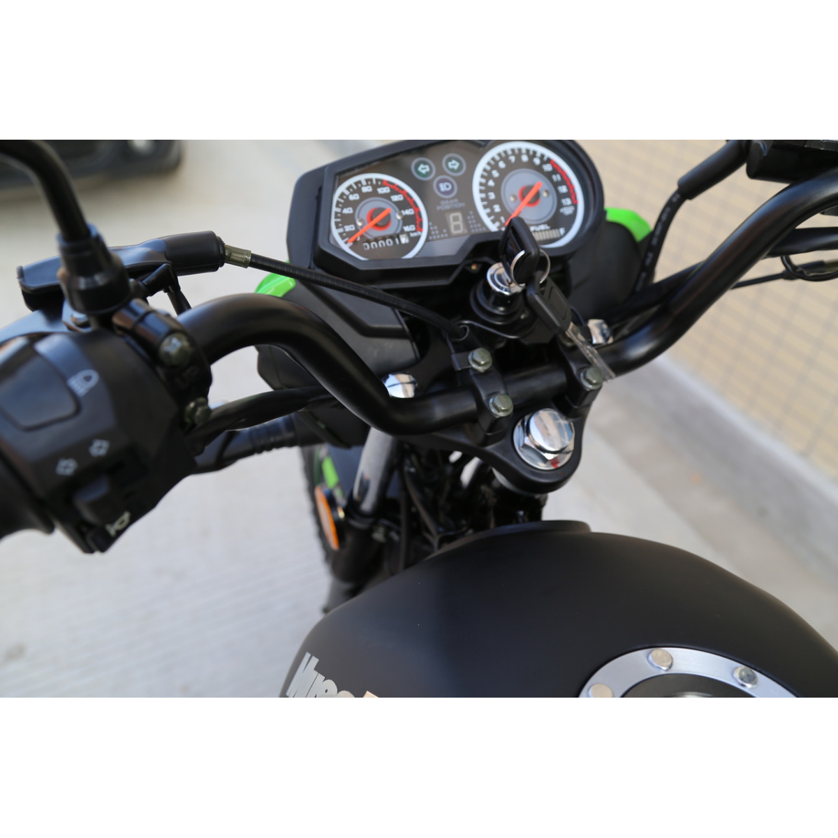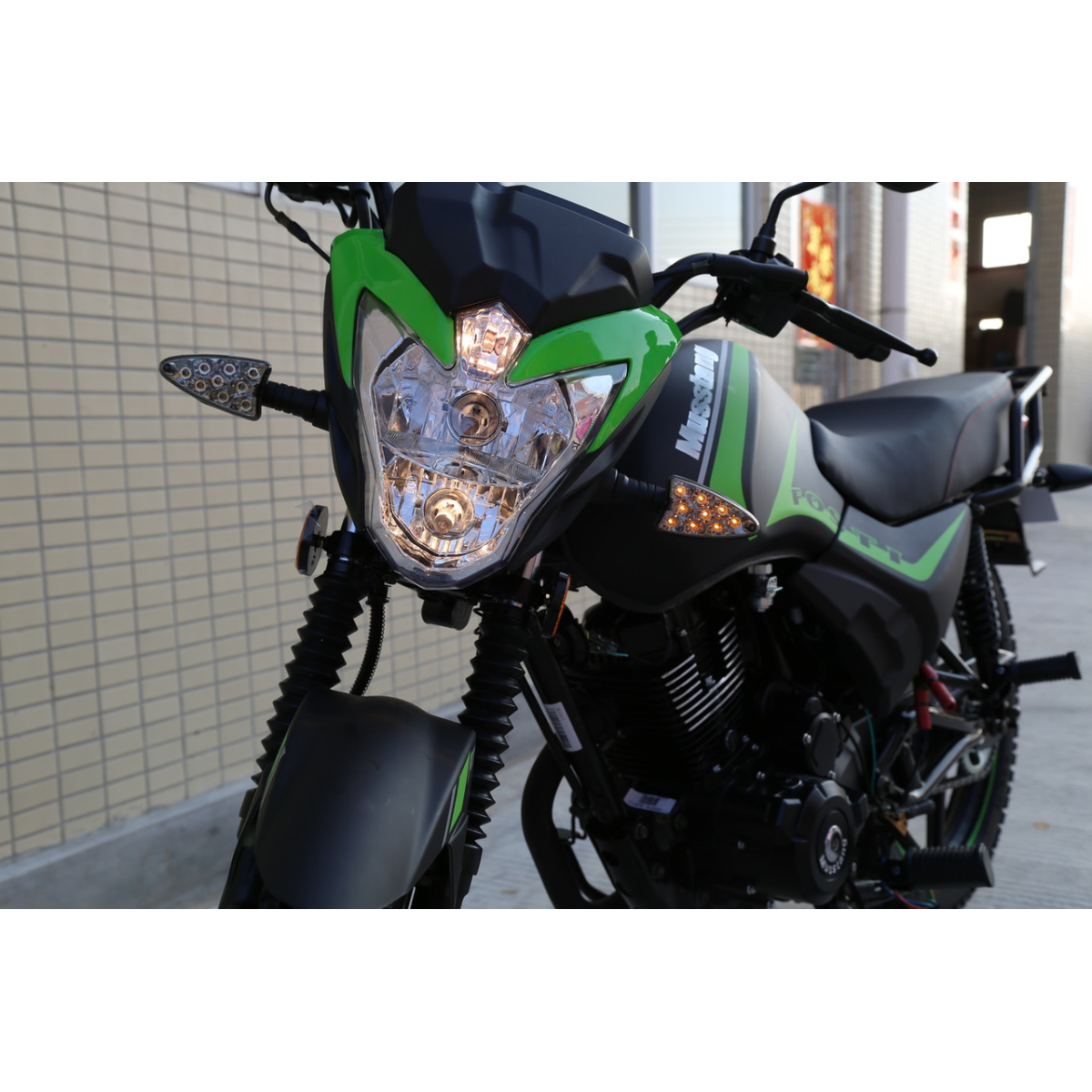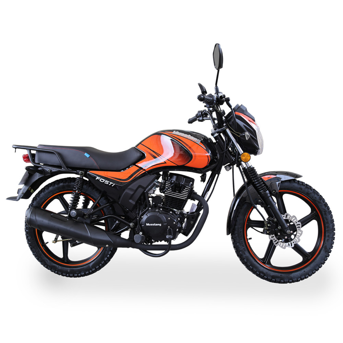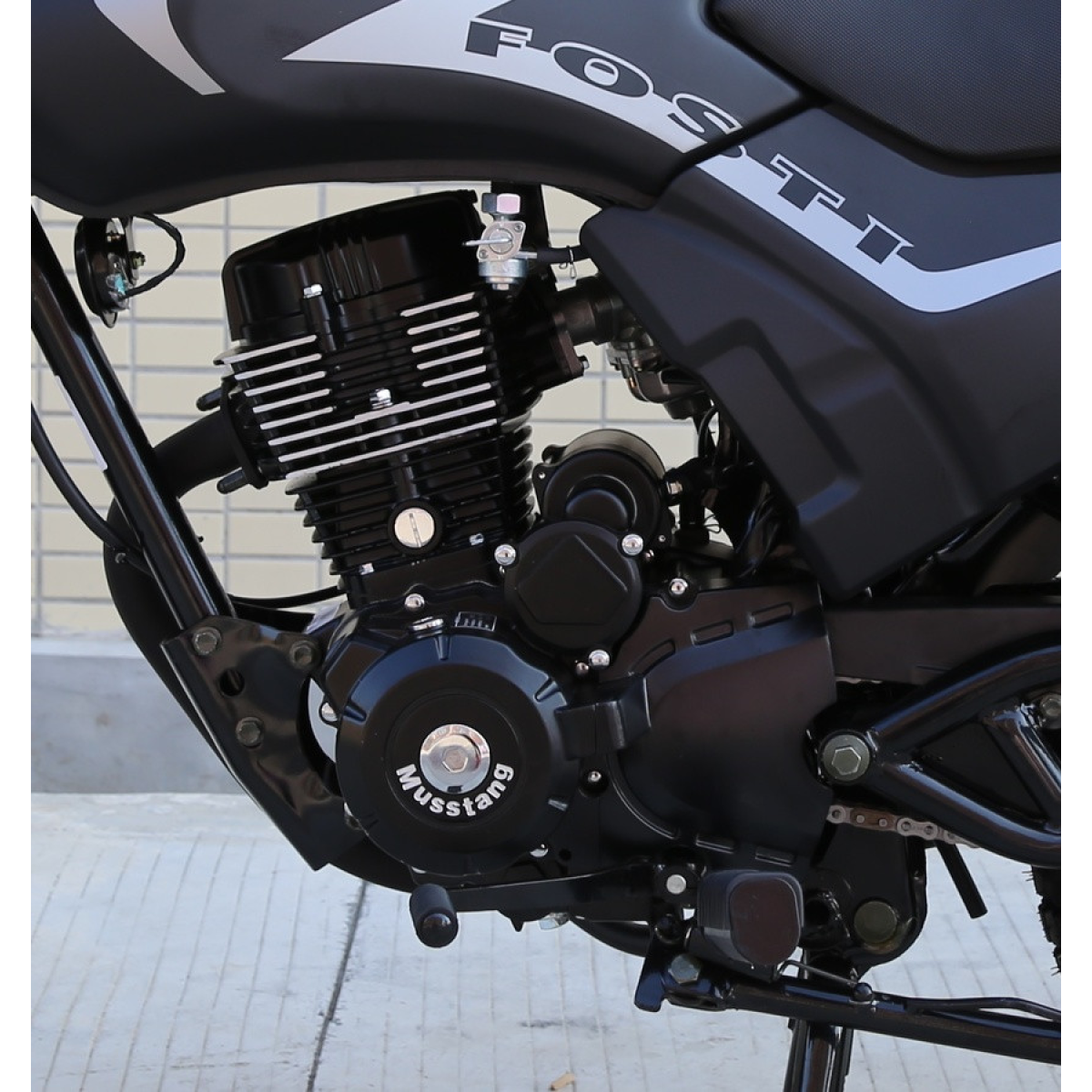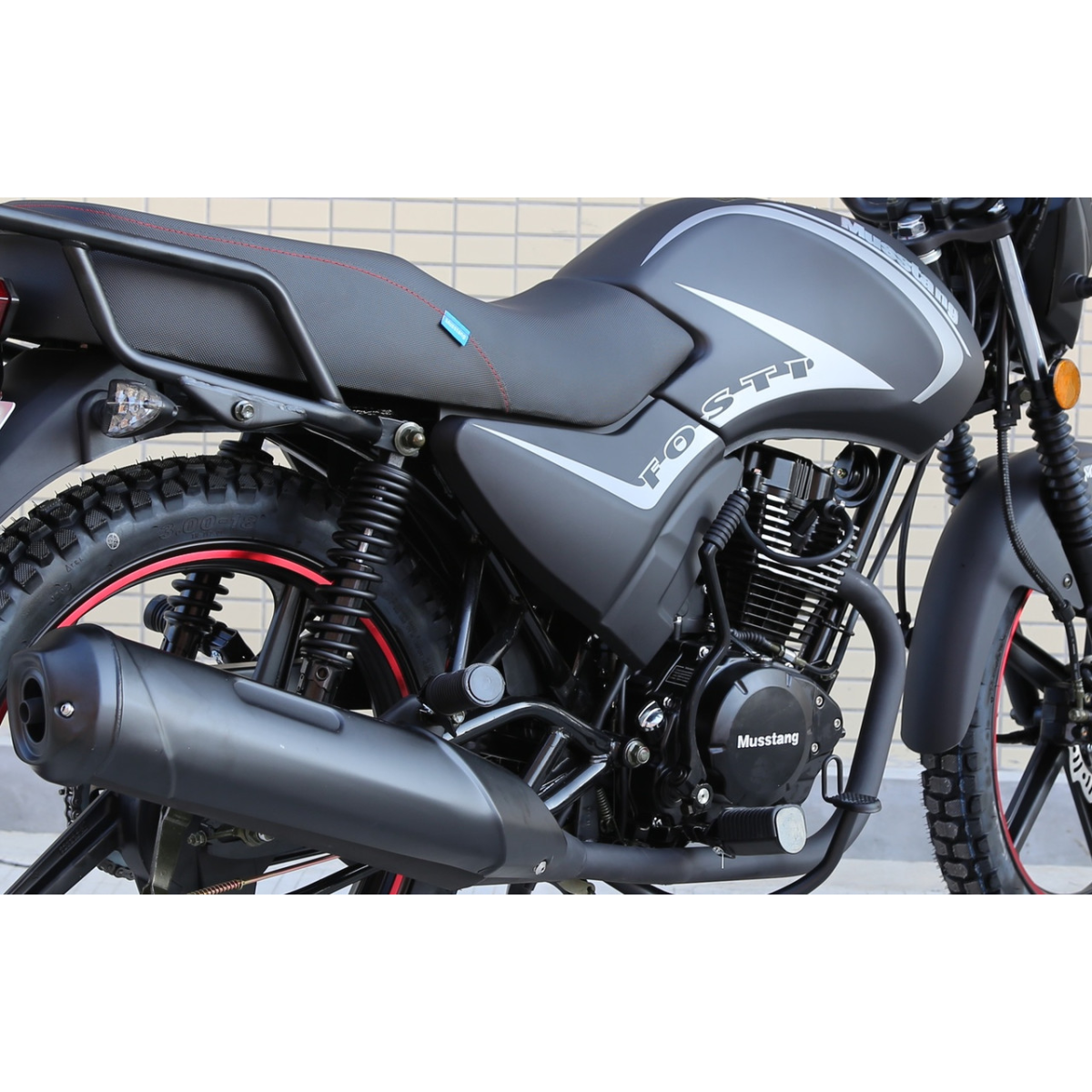 Musstang Fosti навряд чи може претендувати на звання новинки. Зі схожим зовнішнім виглядом або майже таким же в Україні пропонуються подібні моделі. Однак ми вирішили вивести на ринок цю модель після ретельного вивчення недоліків тих мотоциклів конкурентів, які на вигляд “добрі“, а “бідні“ всередині.До того ж постаралися врахувати і побажання потенційних покупців, які нам озвучували інформацію про найбільш бажаних вдосконалення моделі або заміну якихось елементів, які показували себе не належним чином у процесі експлуатації Далі ми розкладемо по поличках технічні та додаткові елементи моделі: Двигун об“ємом 149 см3 розвиває 12 л. с. Це не суперпотужний агрегат, але його конструкція проста і надійна, а ключовим складовим є використання якісних деталей циліндропоршневої групи і всіх елементів КПП. Звичайно є кікстартер для польових умов запуску Важливим елементом є і приймальна труба глушника і сам глушник. Діаметр приймальної труби збільшено на 5 мм у порівнянні з типовими дешевими варіантами. Більш того, сама приймальна труба складається з зовнішньої і внутрішньої частини (труба в трубі) - вона складова. Така конструкція прослужить довше тому, що краще чинить опір температурних деформацій. Сам глушник виконаний у вигляді збільшеного за обсягом циліндра. Така конструкція і звук зменшує і меншою мірою створює опір на випуску, а це важливо для двигуна - адже він не дуже великої потужності і важливо мінімізувати втрати наскільки це можливо. До того ж естетично кожух глушника Musstang Fosti виглядає привабливо і не псує вигляд моделі. Можете самі порівняти на фото з тим варіантом, який пропонується під іншою торговою маркою. Шини - вибір на користь ґрунтових шин був очевидний, тому що цей мотоцикл нечасто бачить асфальт. Тому і передні і задні покришки тут з розвиненими шашечками спеціально для їзди по умовному бездоріжжю До речі, від брызговика на передньому крилі ми свідомо відмовилися - ця штука виконана у більшості з досить жорсткого пластика. Вона занижує кромку крила ще на додаткові 12 див. Якщо під брызготвик нього потрапить камінь або гілка він виступить як важіль який забезпечить надлом кромки крила або тріщину. І у нашої моделі Fosti і в інших крило виконано з АБС-пластику. Це не самий ударостійкий матеріал. Однак саме переднє крило ми “посадили“ подалі від покришки, для того, щоб збільшена відстань виключили налипання каменю або чогось твердого на протектор і при обертанні колеса забезпечило небажану “ударну зустріч з крилом“ А ось ззаду бризговики є. По-перше він виконаний з поліпропілену - тобто м“який матеріал і не буде ламатися при торканні середньої жорсткості (якщо лупити здуру, то звичайно можна вивернути). По-друге - кромка заднього крила розташована високо і зменшення загрязняемости при їзді однозначно необхідно. Амортизатори. Чи не найважливіший елемент конструкції. Ми вибрали варіант довгохідний з збільшеним об“ємом масла в колбі. Такий тип конструкції краще гасить і великі і маленькі коливання при їзді на нерівній дорозі. Пружина сама по собі коротше і жорсткіше. Тому навіть при їзді удвох або одному, але з вантажем таке поєднання амортизатори і пружини забезпечить пружну роботу (без осідання і удару) на великих нерівностях і плавне відпрацювання на дрібних. Зверніть увагу на конструкцію заднього маятникового ва