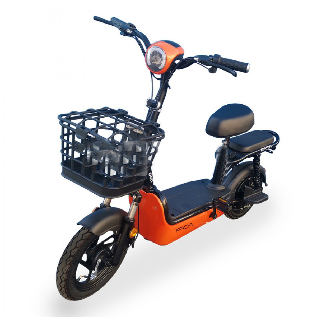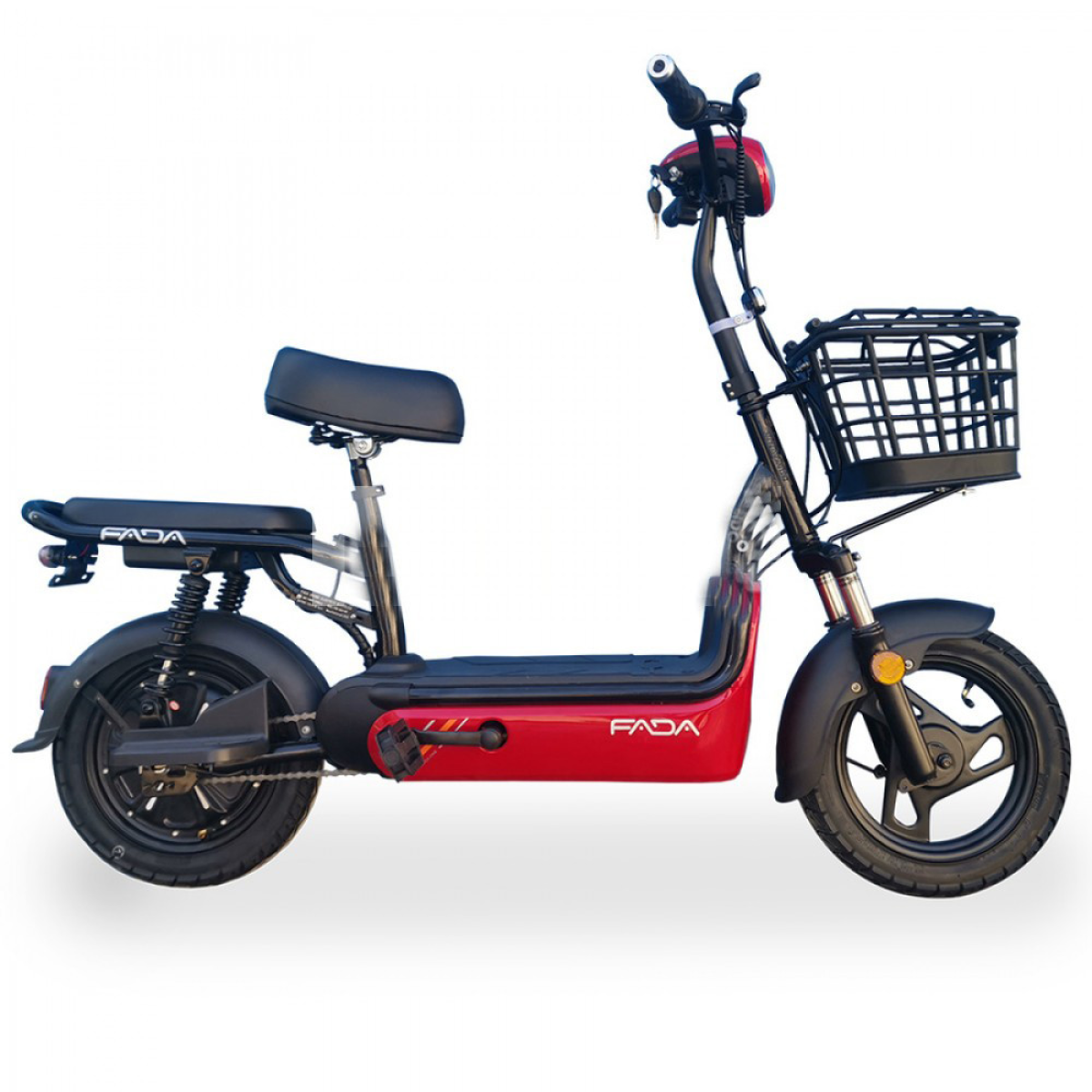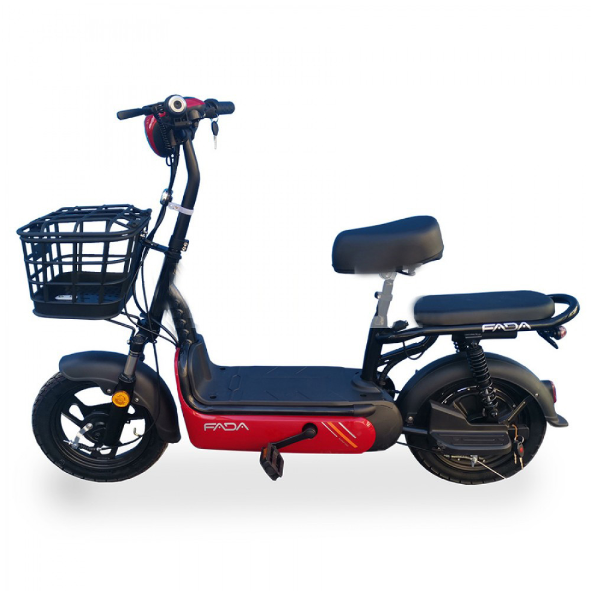 Електричний велосипед FADA LiDO Представляємо модель електричного скутера FADA c оригінальною назвою LiDO. Модель для щоденного використання з характерної їй практичністю, яка притаманна транспортним засобам подібного формату. Пропонується в трьох колірних варіантах: зелений, червоний і жовтогарячий. Електровелосипед оснащений додатковим заднім сидінням, на якому може розміститися дитина. Для цього передбачено і наявність стаціонарних підніжок. Проте більшою мірою розрахована на одного, тому всі вихідні параметри приведені у відповідність з цією умовою. Максимальна швидкість, заявлена виробником може досягати до 30 км/год, а максимально можлива дистанція пробігу до 30 км. Огляду на середньостатистичні потреби користувачів і можливість продовжити рух за допомогою звичайних педалей разом з дуже доступною ціною робить цю модель дуже привабливою індивідуальним транспортним засобом. У стандартну комплектацію входить: - велосипедні педалі; - передня речова кошик ; - система блокування двигуна ( Rear motor lock) Розмірність і тип шин: 2.5 -14 передня /задня, безкамерні шини, колісні сталеві ободи, пофарбовані порошковою емаллю Система гальм : передні / задні барабанні; обидва з ручним приводом від важелем на кермі В конструкції двигуна застосована одна з найновіших технологій, яка заснована на використанні не неодимових магнітів, а алюміній-нікель-кобальтових елементів сплаву AlNiCo. Магніти цього типу володіють хорошою термостійкістю і механічною міцністю. Виливок є найбільш широко використовуваним способом виробництва таких магнітів. Вони використовуються в гальмівних системах ABS в автомобілях, язичкових контактах, датчиках і в медичному обладнанні. Сплав AlNiCo має ряд важливих характеристик: низька коэрцитивность високий рівень залишкової індукції: магніти деяких форм можуть створювати потужні магнітні поля максимальна робоча температура до 450 °C складається з відносно дорогої сировини: нікелю і кобальту Якщо висловитися більш зрозуміло - найбільш важливим і значущим плюсом магнітів AlNiCo є довготривалість їх ефективності. Електро-магнітна індукція зберігається протягом декількох років без істотного зниження, а це забезпечує електромотору тривалу працездатність протягом тривалого терміну експлуатації Тягова акумуляторна батарея свинцево-кислотна, тип батареї AGM з загальним номіналом 48V-12Ah (576 Вт*год). Параметри двигуна Ємність акумуляторної батареї Lead-Acid 48V-12A Запас ходу на електротязі, км. ≤30 Максимальна потужність електромотора, Вт 350 Розрахункова кількість циклів заряду батареї ≤650 Характеристики Двигун, тип Інтегрований в заднє колесо безщітковий електродвигун постійного струму. В конструкції двигуна застосовані Алюміній-нікель-кобальтові магніти (AlNiCo). Потужність двигуна 350 Ват Макс. швидкість при русі на електротязі км / год ≤30 Охоронна сигналізація Є Харчування для підзарядки батареї Електрична мережа з напругою 220 Вольт ( заводський модуль для підзарядки додається в комплекті) Розширений стандартний пакет опцій Заднє сидіння і підніжки для заднього пасажира Задня світлотехніка Габаритний ліхтар/стоп-сигнал Передня світлотехніка LED-фара Тип батареї Свинцево-кислотна батарея з сумарною напругою 48 В і ємністю 12A . Середній час повної зарядки від 6 до 8 годин Тип приладовій панелі Сегментна електронна панель приладів Тип пр