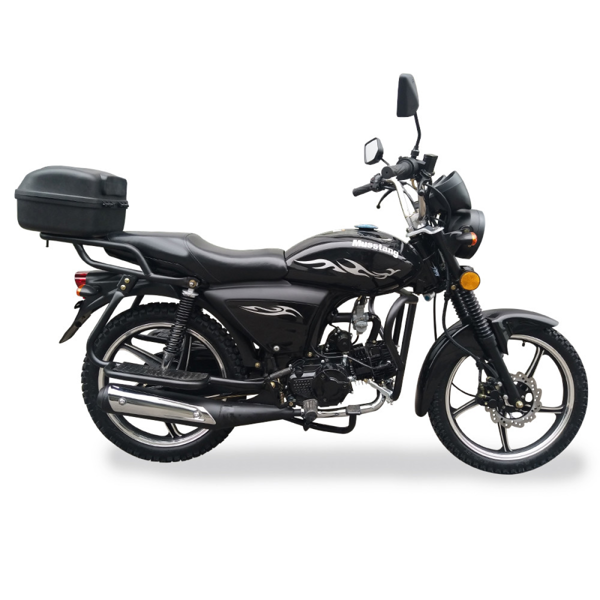 Почнемо з найбільш значимого: всі моделі Musstang Альфа FIT 125 стандартно оснащуються Новими легкосплавними дисками і переднім дисковим гальмом. Це безсумнівно корисний і важливий з точки зору безпечної їзди крок, вважаємо, немає сенсу говорити про те, наскільки потрібна ця опція. Супорт дискового гальма двухпоршневой і він аналогічний тих деталей, які встановлюються на багато моделей 150-ти кубових мотоциклів. Це означає, що підібрати колодки до нього не складе ніякої праці і вони вже доступні в продажу - тобто проблем в експлуатації з механізмом дискового гальма не виникне.