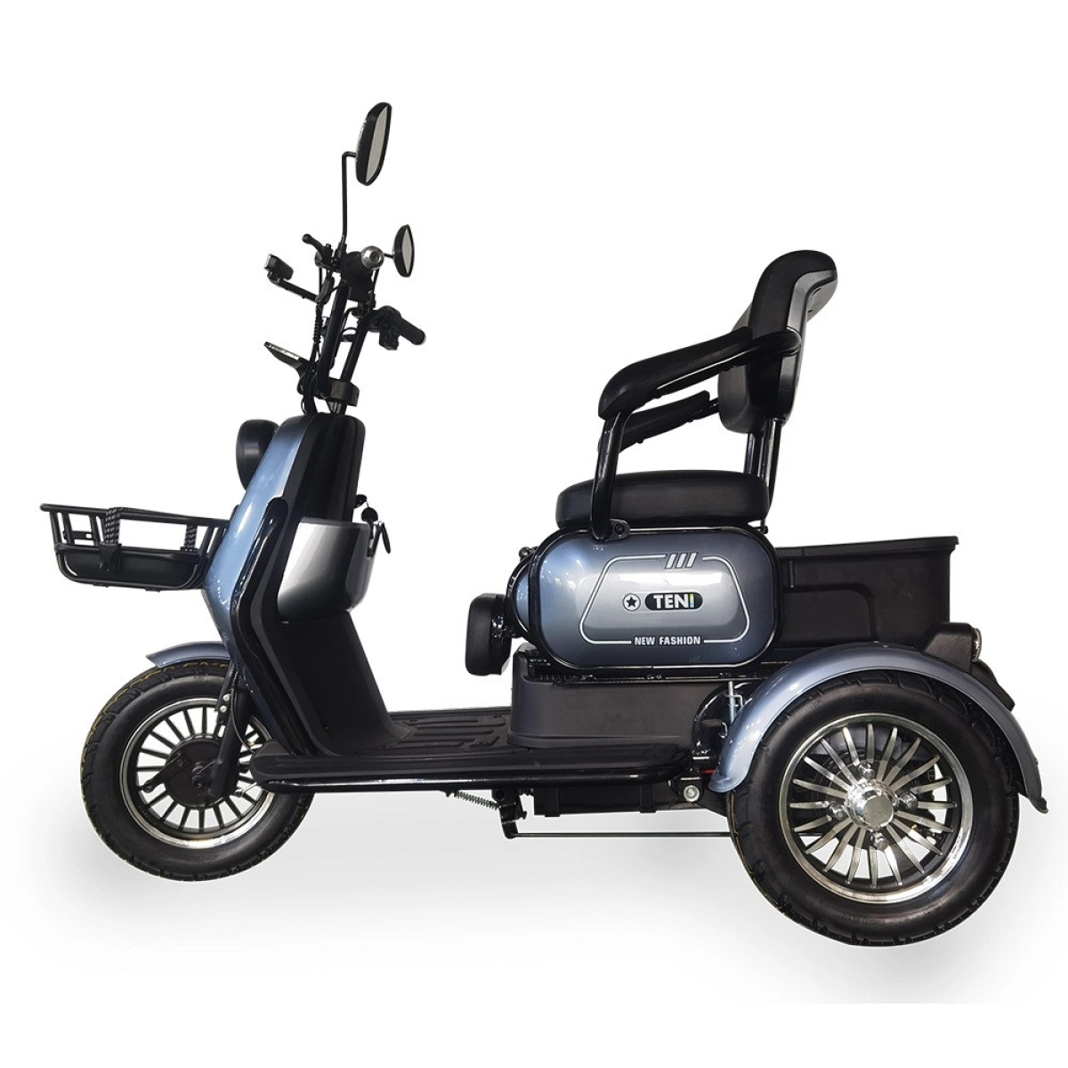 Триколісний TENi у типовому режимі використання розрахований для використання водієм, пасажиром. Якщо на трайці переміщається одна людина, він може вибрати собі зручне положення завдяки величезному діапазону регулювання. Вона призначена для ситуацій, коли транспорт використовується людьми з обмеженими можливостями або травмами ніг, коли єдине зручне положення це напівзігнута нога, а отже, для неї має бути достатньо вільного простору. Саме сидіння має бічні підлокітники та спинку з м“якою вставкою для зручнішої посадки. Крім цього, у моделі передбачена можливість трансформації сидіння для забезпечення окремих місць. На фото позначено три варіанти конфігурації сидінь. У принципі в поїздці на коротку дистанцію на TENi можна розмістити і трьох осіб, за умови, що третьою буде дитина. Якщо ж їде одна людина, середнє сидіння можна перевернути на 180 градусів (дном вгору) і у складеному вигляді воно розміститься під основним, а маленьке сидіння для дитини просто складається вниз і не заважає при їзді дорослому. Про середнє сидіння в розкладеному стані не можна сказати, що воно винятково зручне. Але доросла людина не дуже значної комплекції може на ньому розміститися та доїхати до місця призначення. Сидіння для третього молодшого пасажира орієнтоване винятково на дітей. Відкидна подушечка попереду невелика за розміром, проте спеціально для зручності та безпеки на передній частині під кермом знайшли місце зручні поручні, для того щоб дитина могла триматися і мати точку опори. Крім цього, у передній частині під кермом передбачені невеликі відсіки для розміщення пляшки з водою або дрібної поклажі.